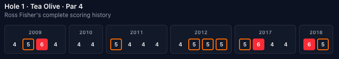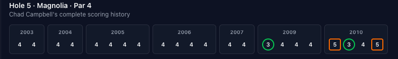 Chad Campbell is our leader for #5, including a stretch where he made 14 pars in a row! Then had to go mess it up with a birdie in 2009...