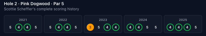 Number 2 earns the distinction of having the only albatross in our dataset, with Louis Oosthuizen holing out in 2012. There have only been four albatrosses in Masters history and they're spread perfectly across all four par 5s on the course. I like balance, so I'd prefer it stays this way forever, unless there can be four in one year.
