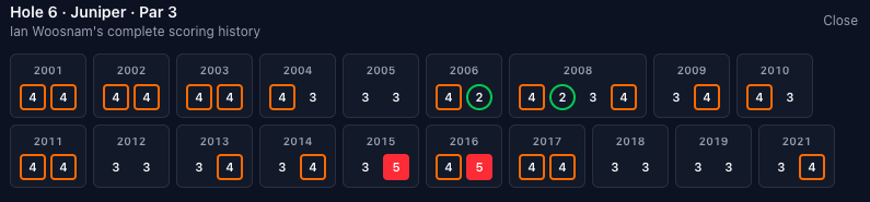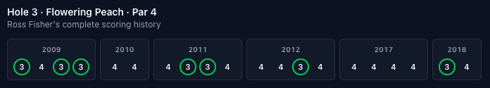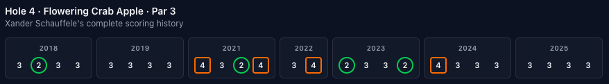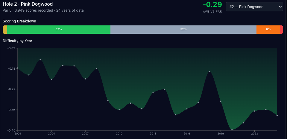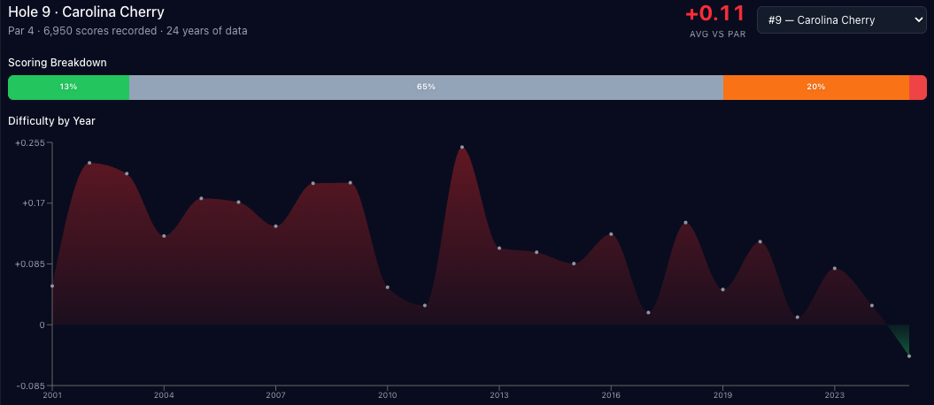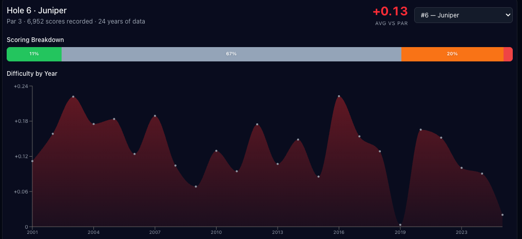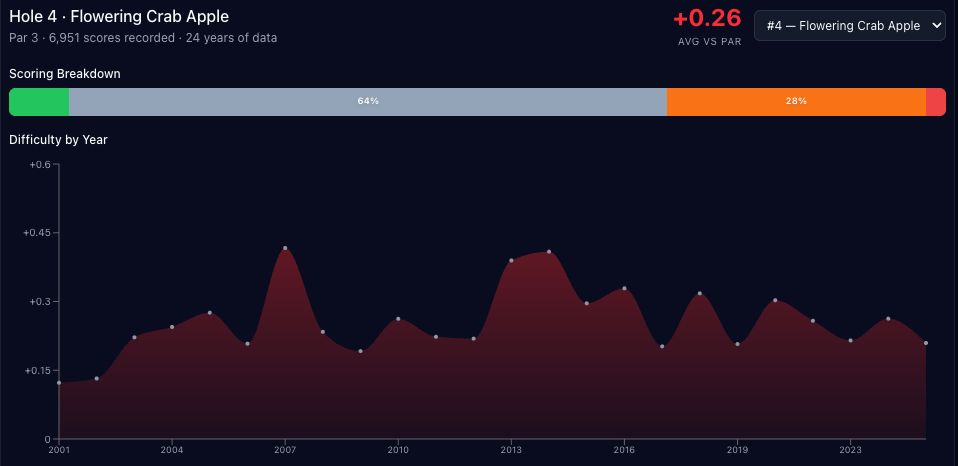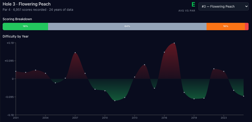 Scoring-wise, the third hole has gone back and forth over the years, hovering almost exactly at E since 2001. It's one of the only holes that tends to go back and forth between over and under par in the scoring chart.