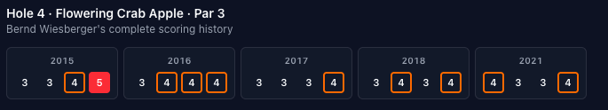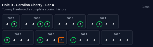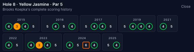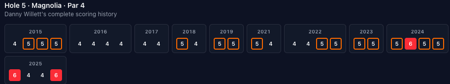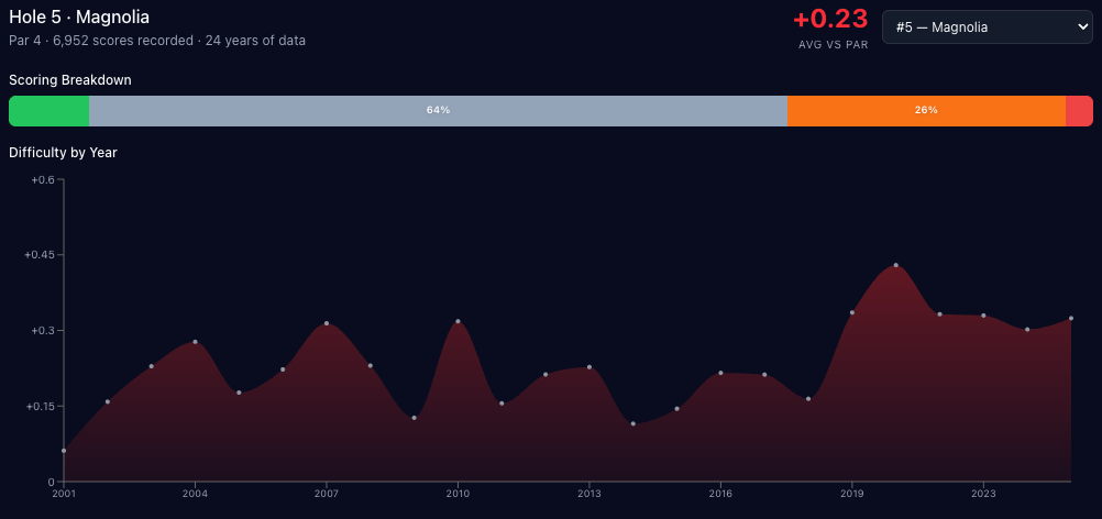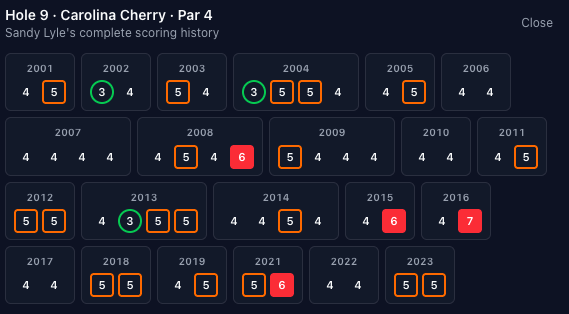Unfortunately, not too many blow-ups on this hole, the highest score is a triple-bogey 7 made by a bunch of guys. There have been ten eagles, with three of them occurring in 2024 (Adam Scott, Jake Knapp, and Patrick Cantlay). I may just be bad at using the tool but I couldn't find the Adam Scott eagle in the Masters vault.