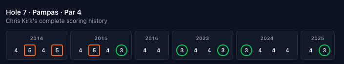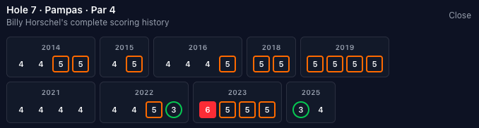 I can't explain it but I read "Pampas" in Baby Billy's "Tennjus" voice. The seventh started with an under-par scoring average in 2001 and has been consistently above par ever since. And nothing too crazy on either end of the scoring spectrum so we'll keep this train rolling.