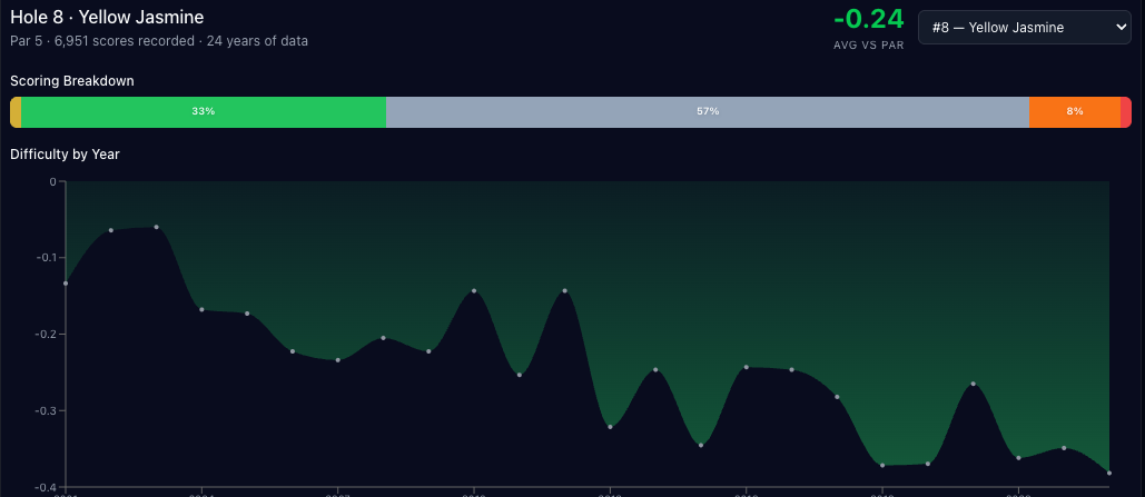 Similar to the trend we saw play out for #2, the other par 5 on this side, as driving distances have increased, scoring has continued to improve, with last year being the lowest scoring round recorded.