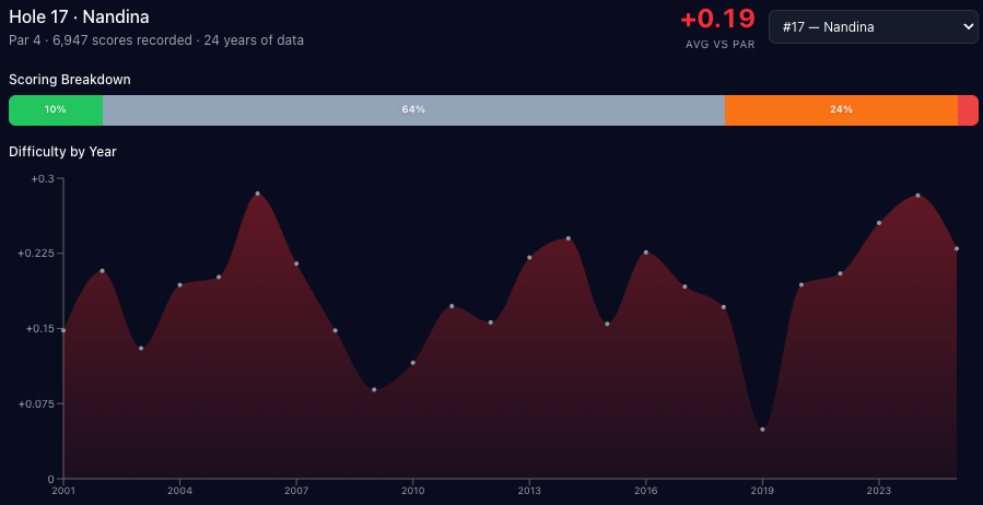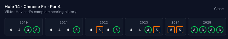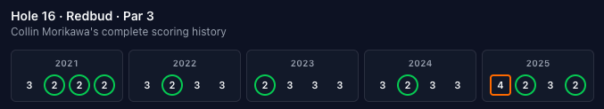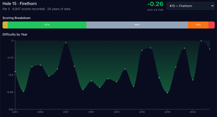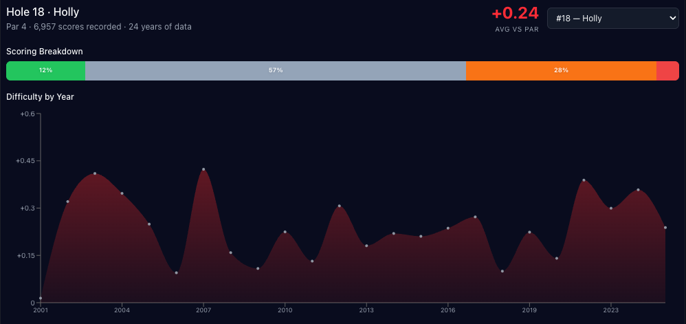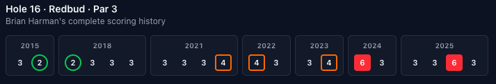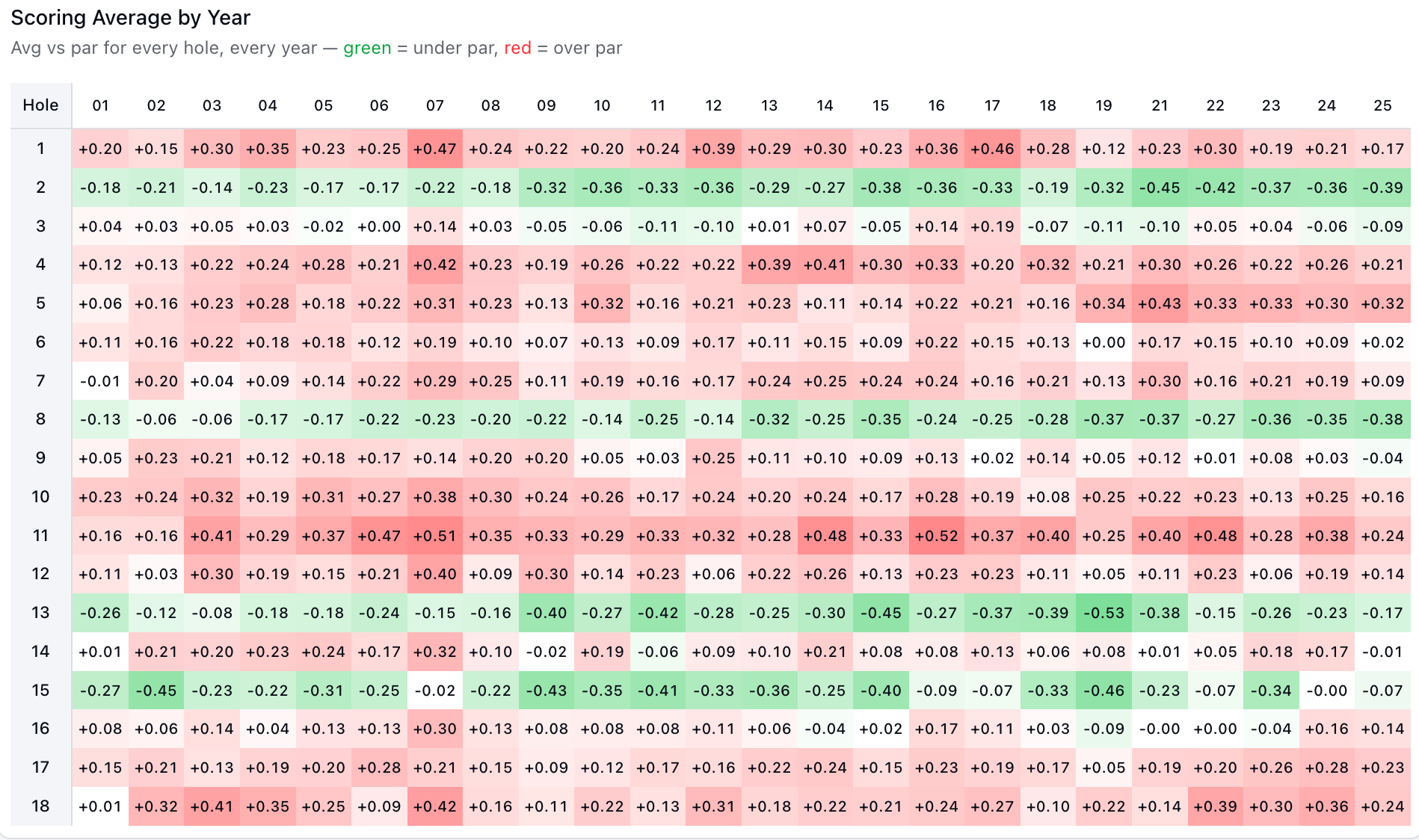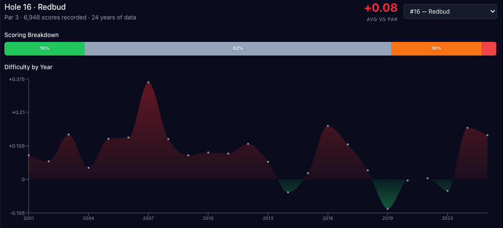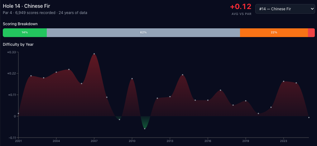 Love to see a hole that has oscillated between under-par and over-par. 14 has dipped into under-par status three times: 2009, 2011, and 2025.