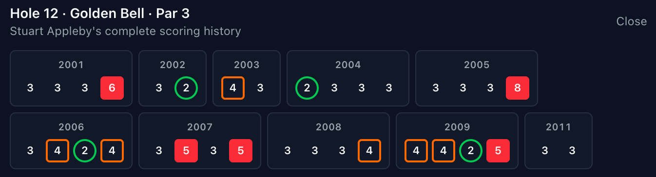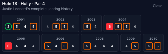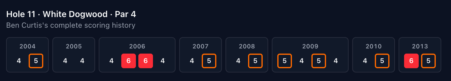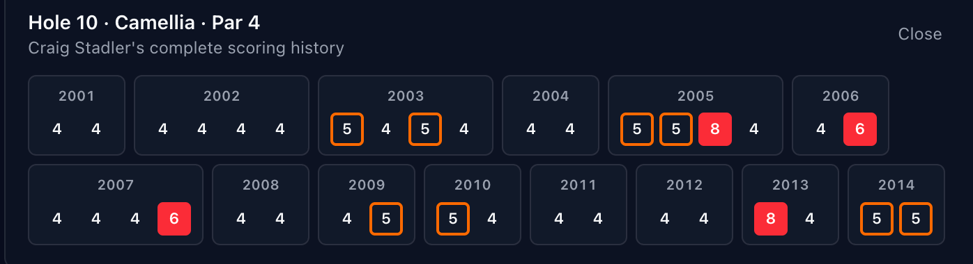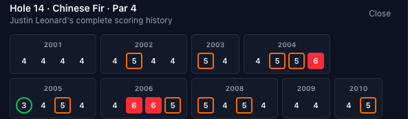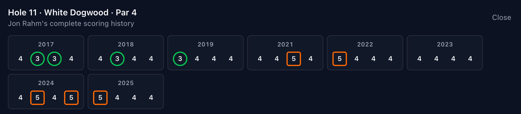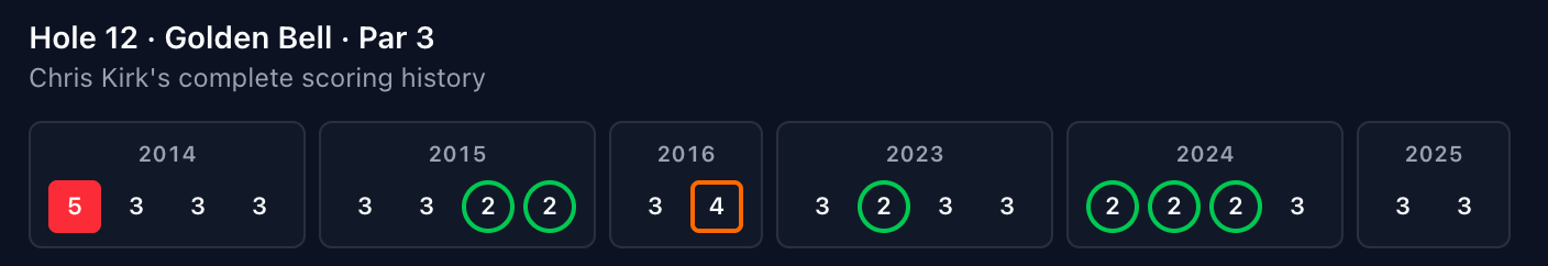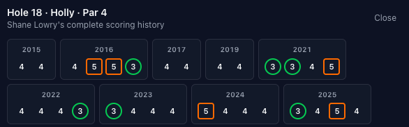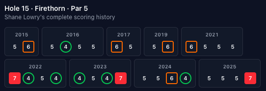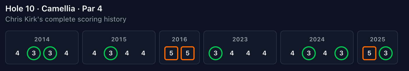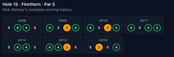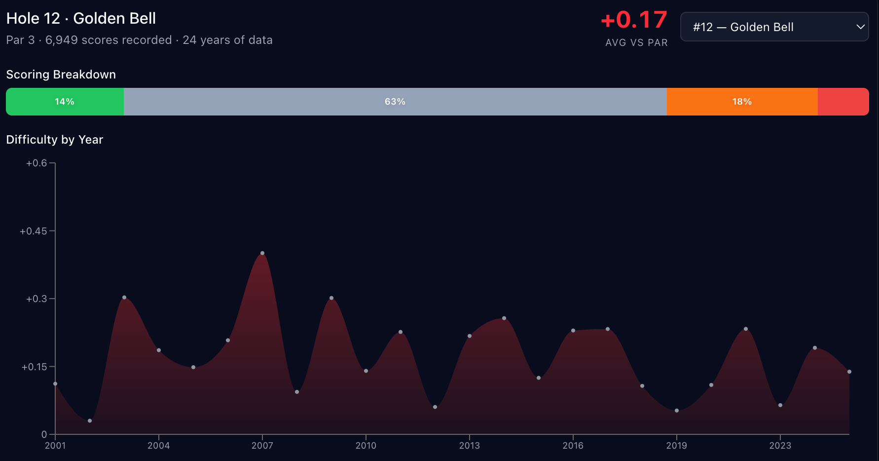 Love to see a hole that has oscillated between under-par and over-par. 14 has dipped into under-par status three times: 2009, 2011, and 2025.