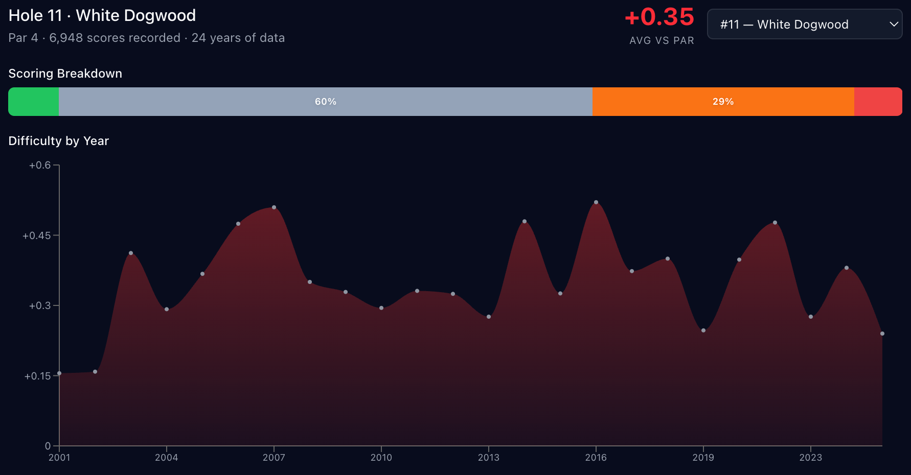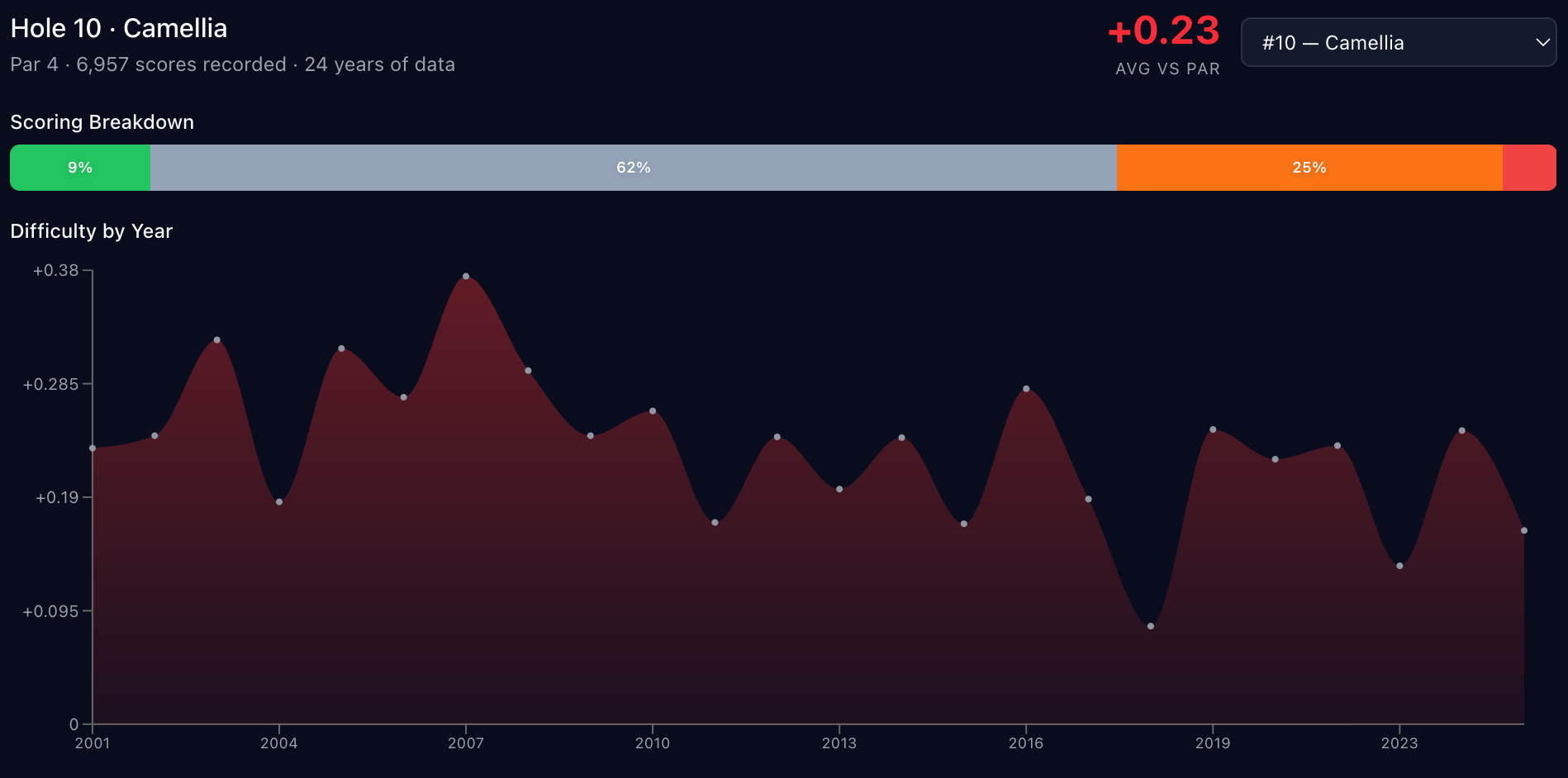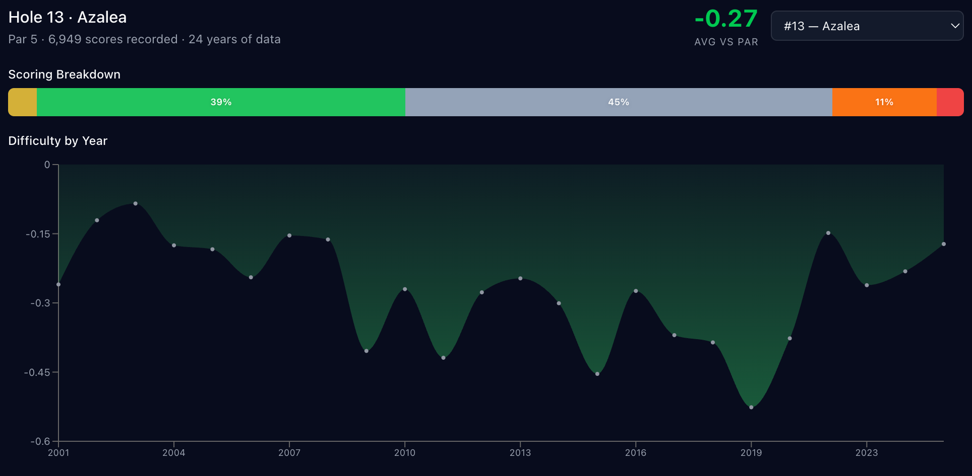 Today, we'll be focusing on each hole on the second nine at Augusta National – difficulty, how scoring has trended over time, any interesting player-level stats for a given hole, and of course...any memorable blow-ups.
