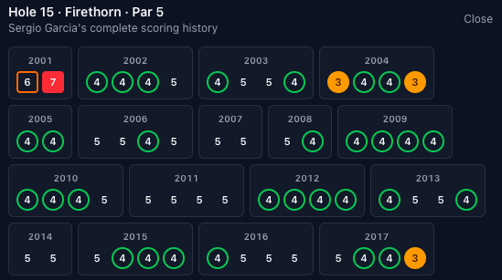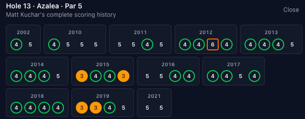 A 13. Five balls into the water. A total ungluing, the worst score at this hole ever. And the second highest at any hole in our dataset. He goes even par from here on out at the 15th. This broke him.