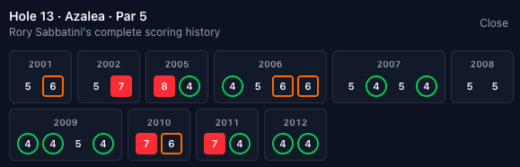 Everyone's favorite mid-2000s golfer, Rory Sabbatini, struggled mightily with this hole including a stretch of +5 in two holes and +5 in three holes. He did finish his Masters career strong with three birdies in a row. If you only look at his last three holes and Kuchar's last three holes, Rory's beating Matt like he stole something.