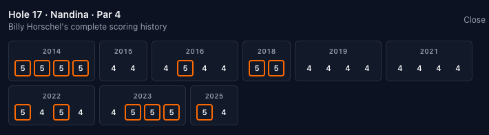 Billy Horschel (4.43 avg) has an...oddly pleasing set of bad holes here. 17 pars and 13 bogeys. Billy didn't make the field this year but we need him back in 2027 to make four bogeys to earn a perfect split of pars and bogeys.