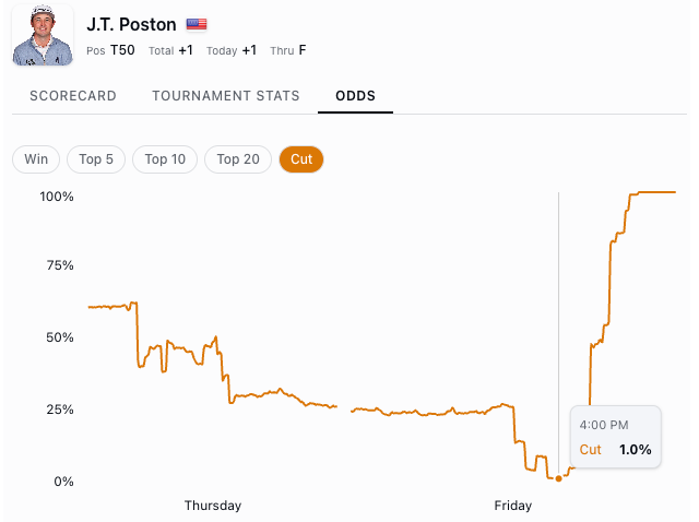 When the cut pressure is on, J.T. Poston is the best player on tour. After shooting a 76 on Thursday and having a couple bogeys in a row on 10 and 11, Poston got all the way down to a 1% chance of making the cut.