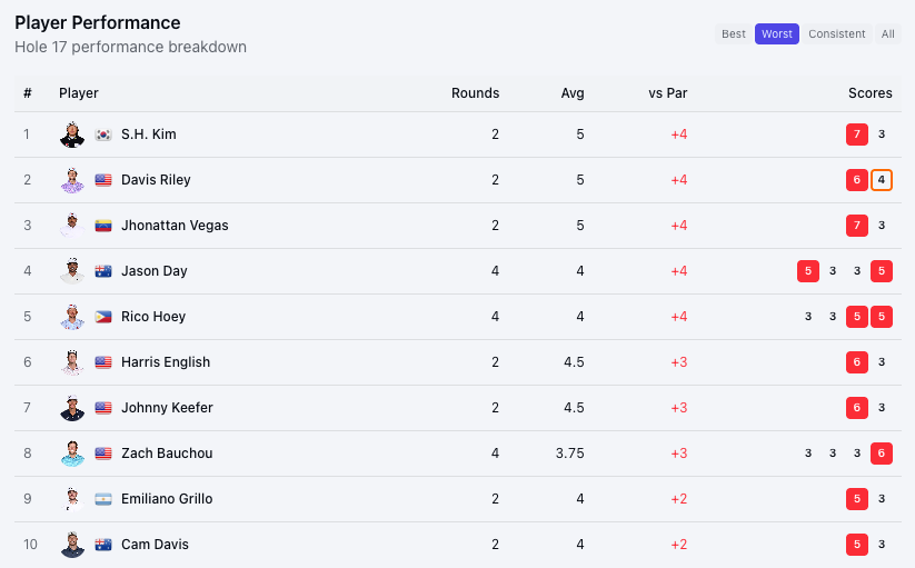 Cam Young wins the 17th this week as the only player to make three birdies. Hate to pick on Davis Riley again but he tied for the worst performance at 17 this week. At least he didn't make a 7 like some other people...